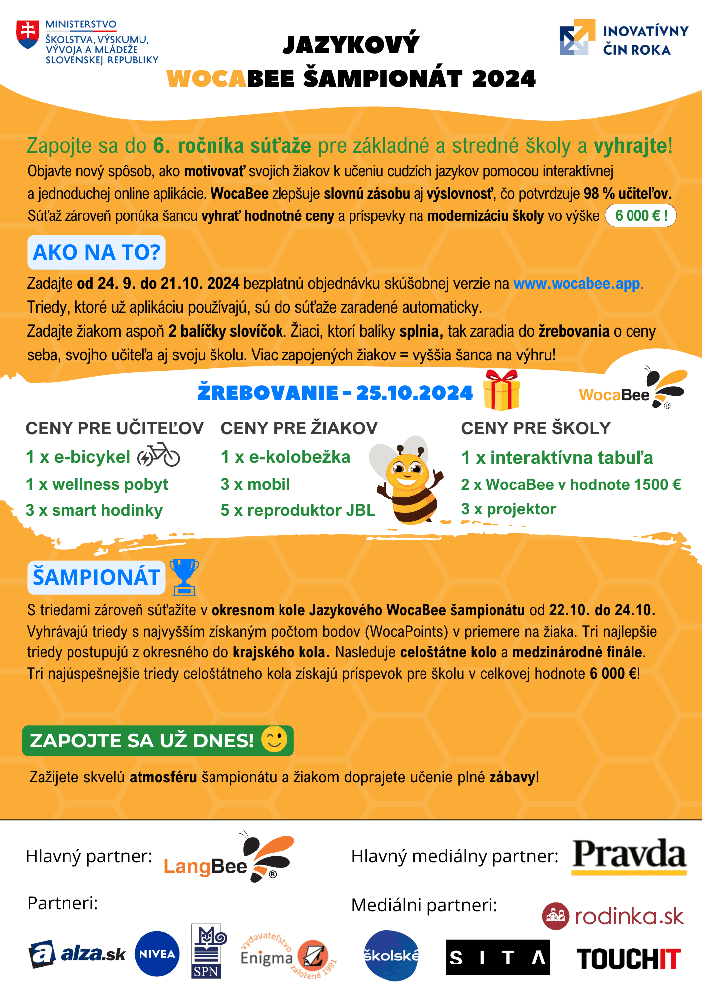 1. miesto 👉 príspevok na modernizáciu školy v hodnote 3000 € (2000 € licencie WocaBee + 1000 € šek)